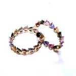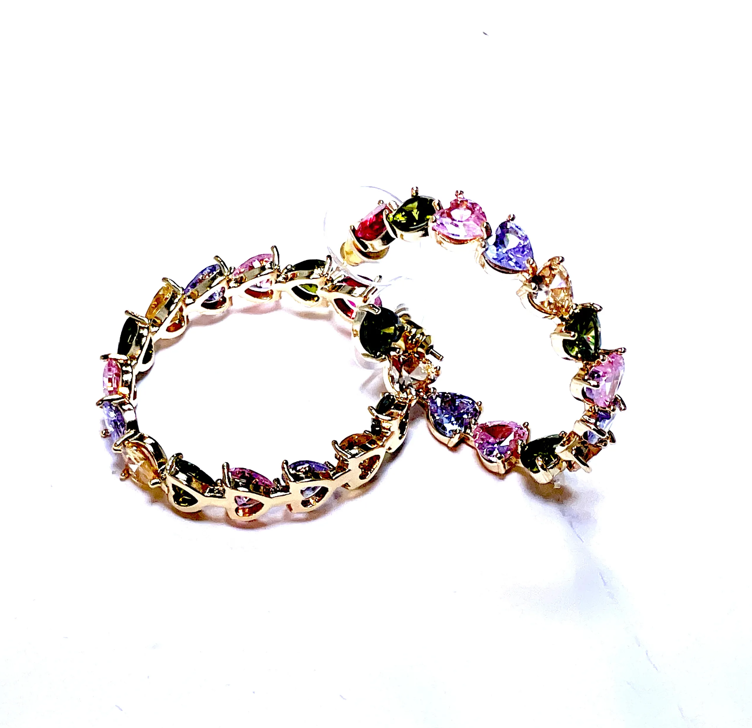 ORECCHINI A CERCHIO BUCO Metallo dorato con cristalli a forma di cuore colorati mm 5×6, Diametro Cm 3,5