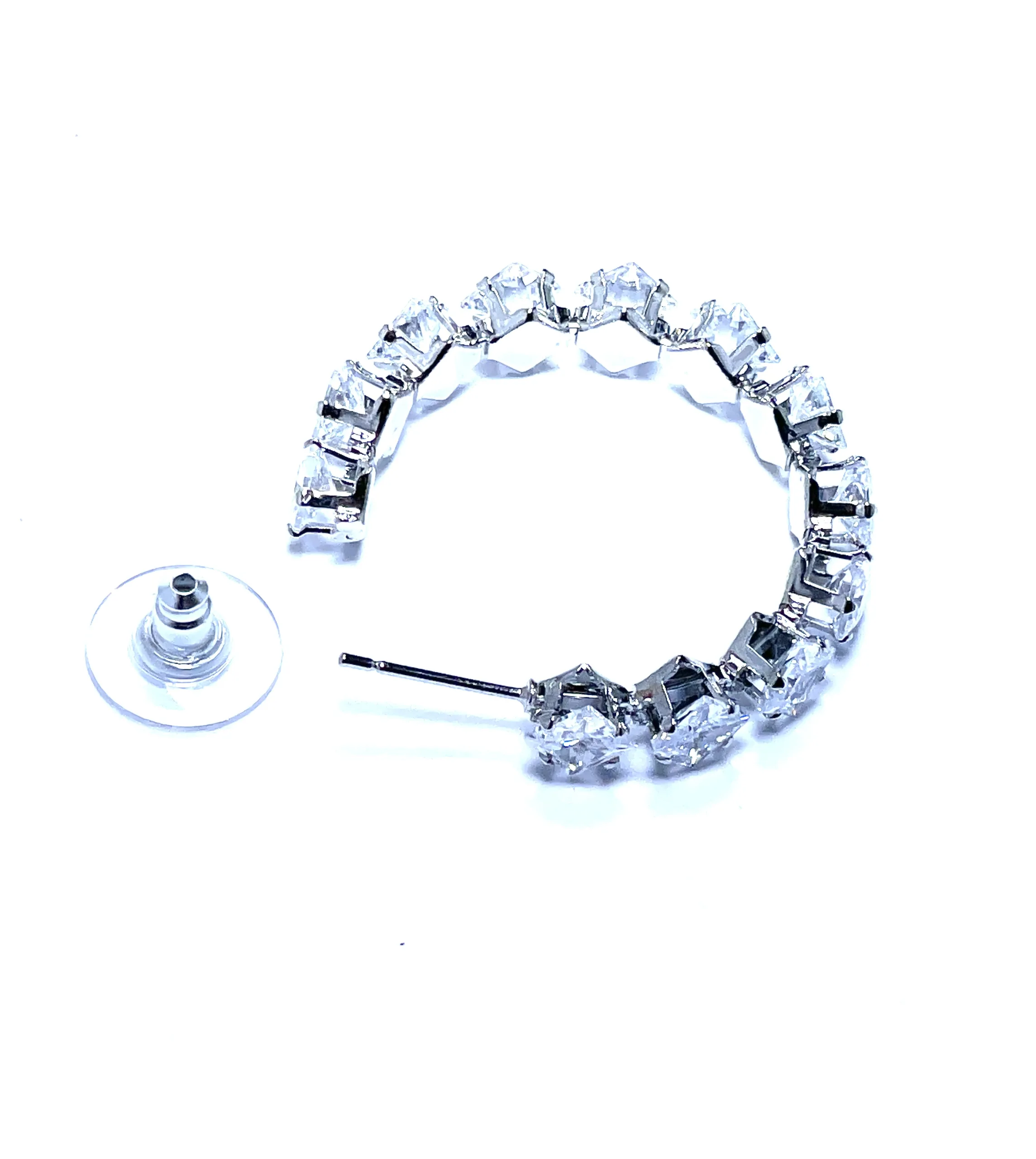 Orecchino cerchio cuori cristallo bianco in metallo rodiato a buco