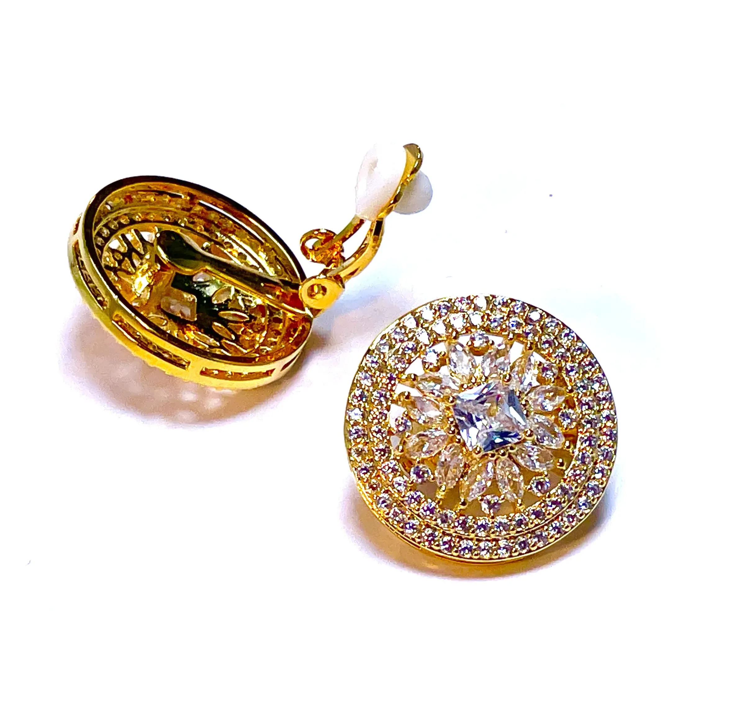 Orecchini clips base acciaio inox dorato a forma tonda tipo rosone diam mm 20 in cubic zirconia