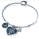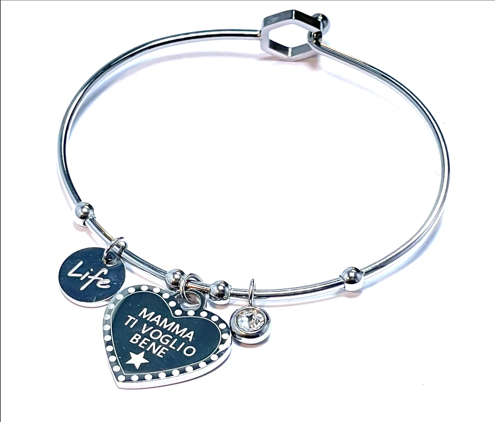 Bracciale rigido in acciaio inox rodiato con cuore e scritte per mamma