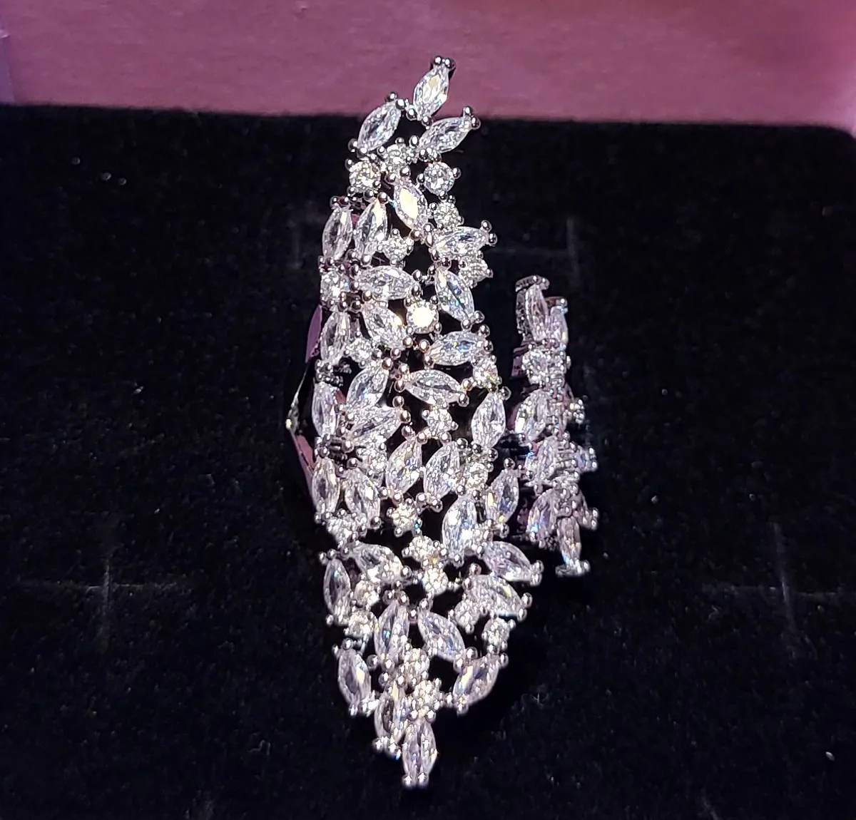 Anello placcato argento rodiato regolabile sulla parte centrale alta dell’anello – gemme in Cubic Zirconia forma navetta mm 3,5 x 2 millimetri, lavorazione ispirata alla serie ghirlanda di Pasquale Bruni – formano una cascata di petali di 46 x 21 millimetri e 1 cascata di petali 20 x 10 mm che si avvicinano permettendo di stringere o allargare la misura dell’anello