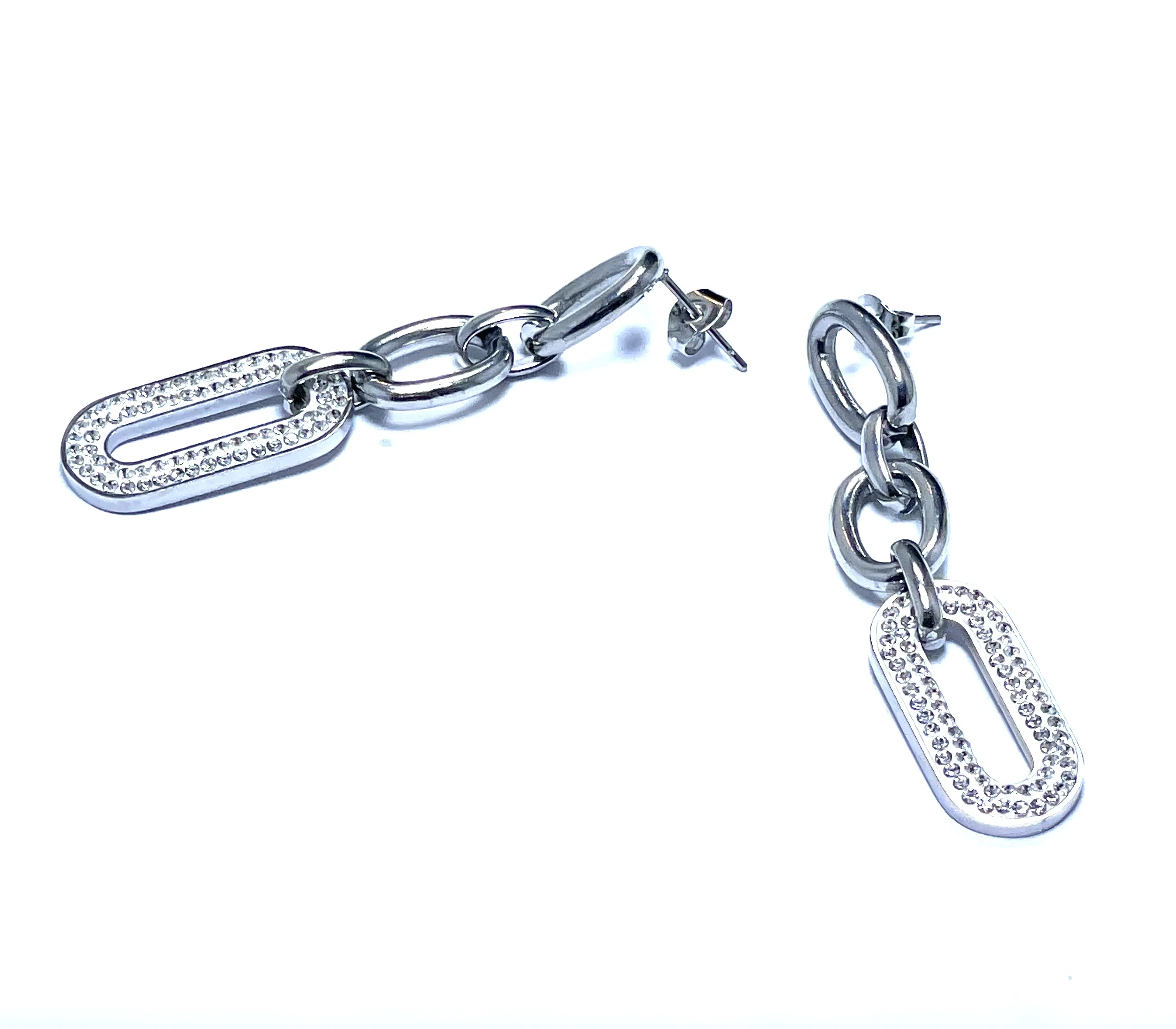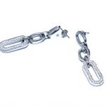 Orecchini a buco pendenti in acciaio rodiato 2 ovali mm10x13 + 1 ovale cubic zirconia pavé mm23x10